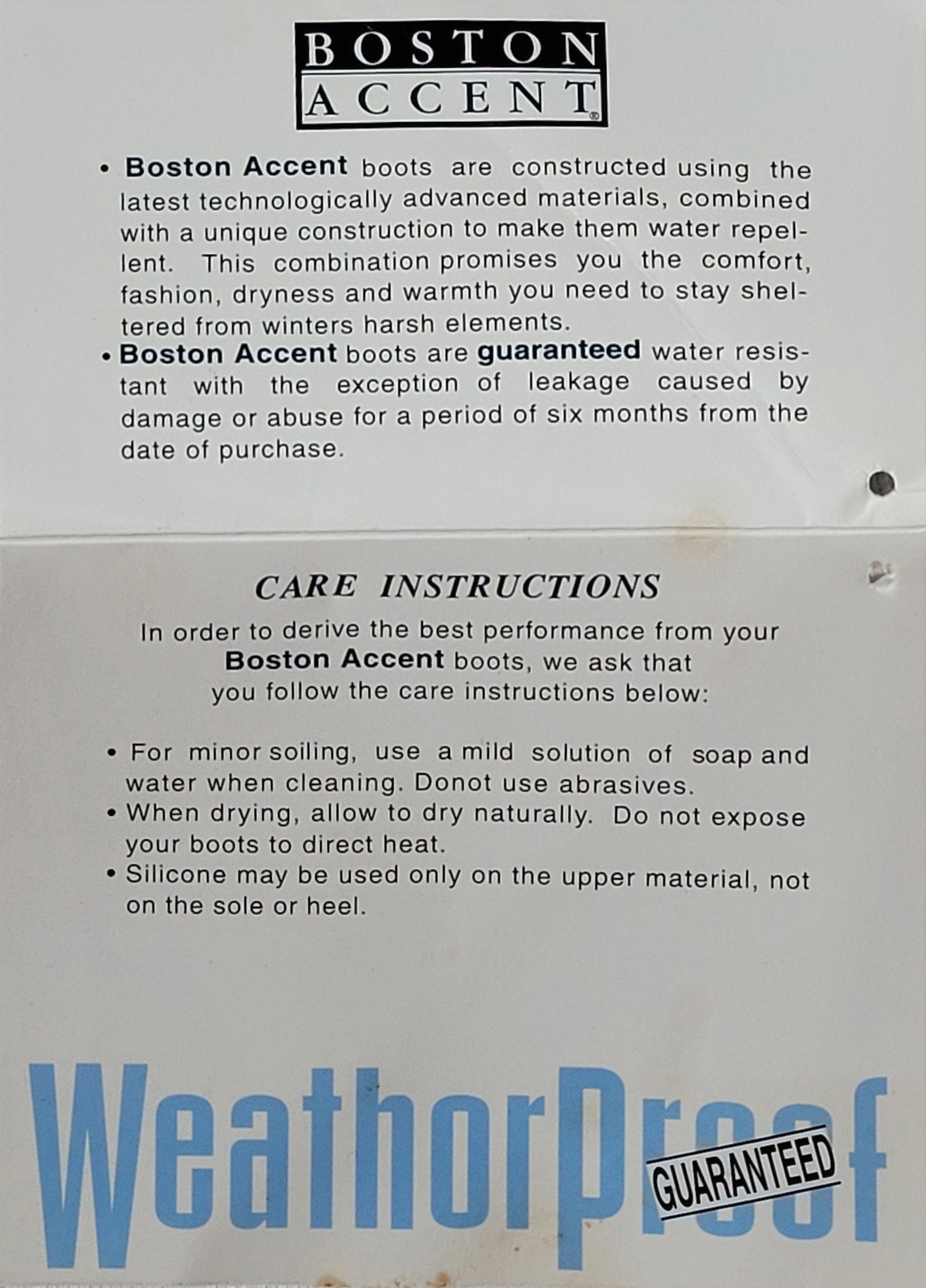 Includes: Original Boston Accent WeatherProof box, care tags, and insoles card