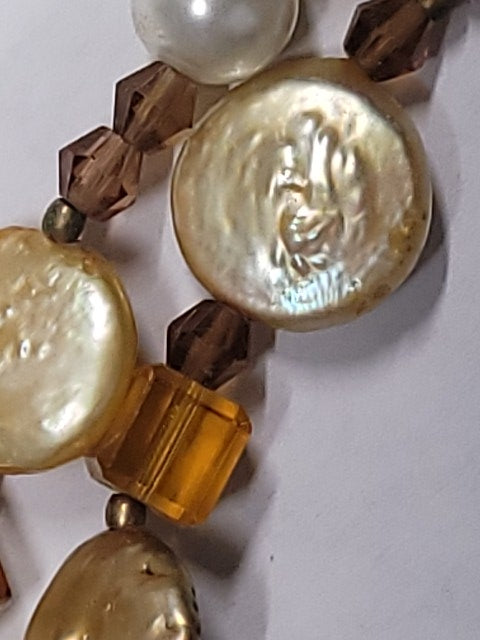 Add a touch of elegance to your wardrobe with this stunning handcrafted beaded necklace. Featuring luminous mother of pearl beads, accented with amber-hued crystals and delicate pearls, this piece beautifully combines earthy tones with a subtle shimmer. Its layered design provides both depth and texture, making it an eye-catching addition to any outfit. This versatile necklace is perfect for casual or formal occasions and will complement a wide range of styles.