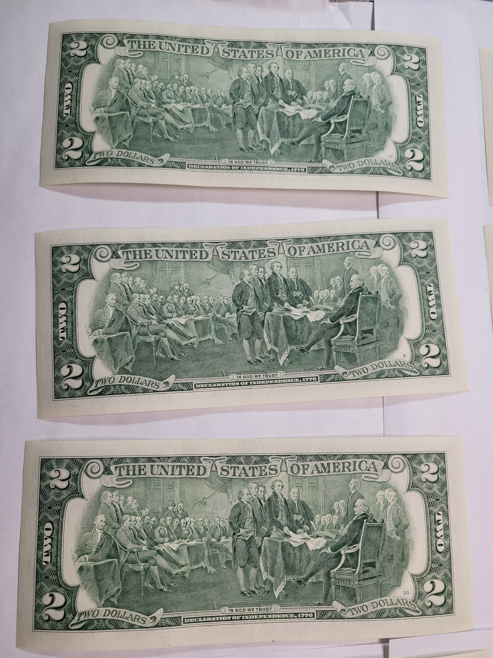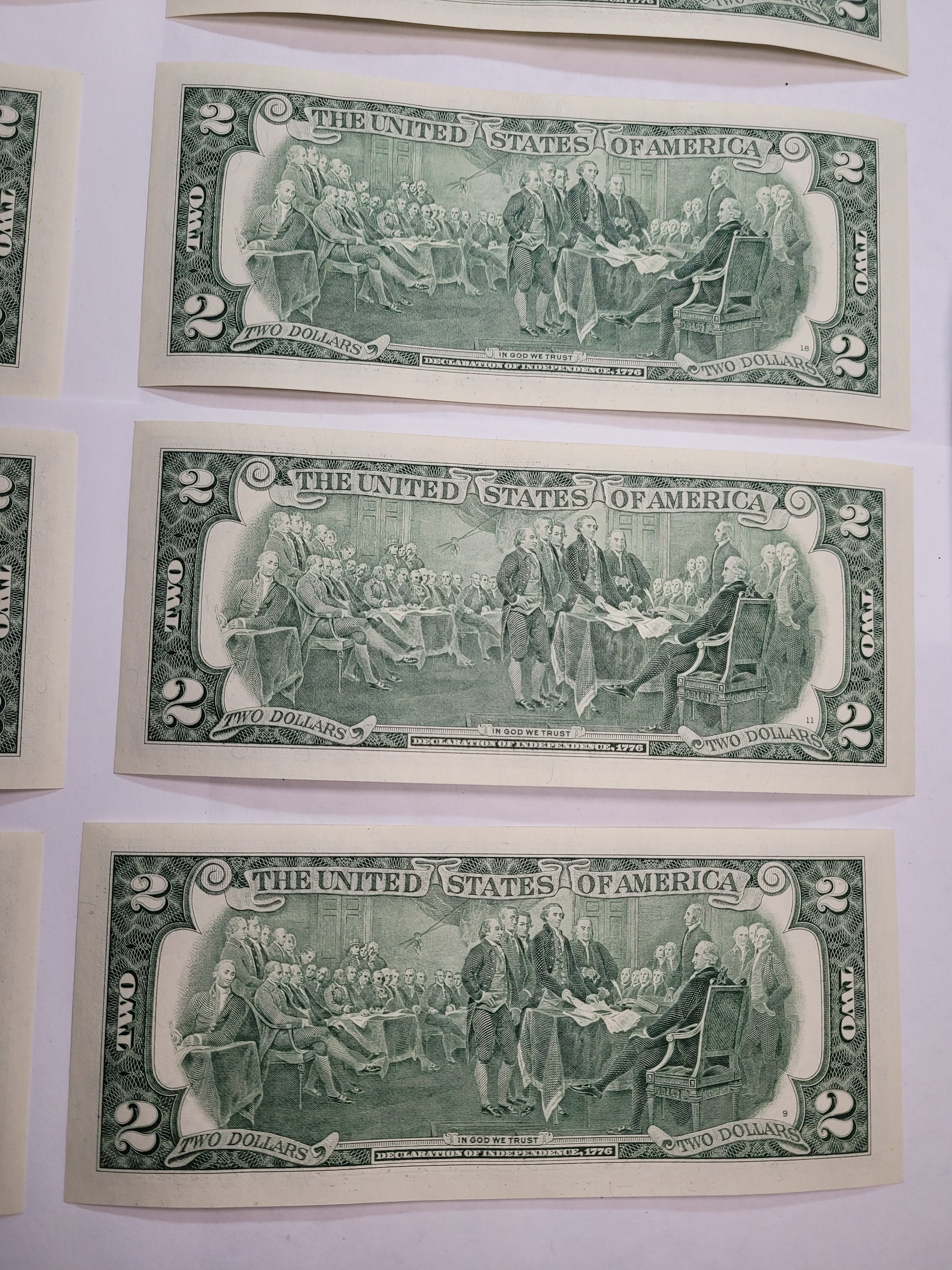 This exceptional lot includes 10 pristine $2 Federal Reserve Notes, most of which feature sequential serial numbers, making this a rare and desirable find for collectors. These notes, celebrated for their iconic design, highlight Thomas Jefferson on the obverse and the historical depiction of the Declaration of Independence on the reverse. Their condition and sequential numbering make them perfect for both seasoned and new collectors.