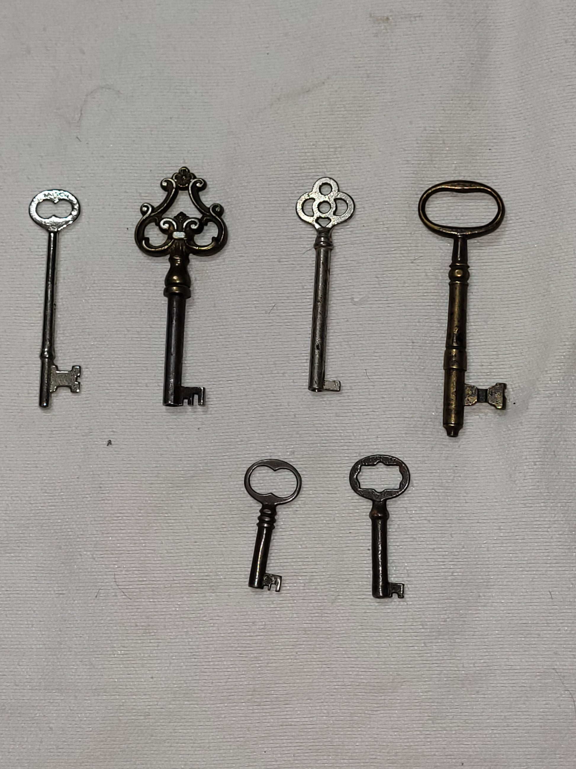 Lot of six (6) antique skeleton keys, mixed styles and sizes. Includes one ornate Victorian brass filigree key, one oval bow barrel key, and four smaller cabinet/trunk keys. All keys are original vintage antique pieces (not modern reproductions). Perfect for collectors, crafts, décor, or restoration.