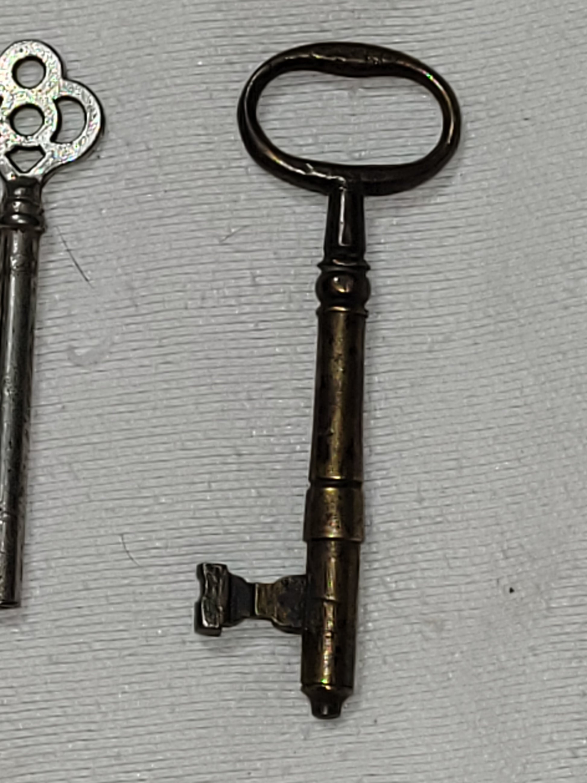 Vintage condition with normal age wear, patina, and oxidation consistent with antique metal keys. No cracks or breaks. All bits and barrels intact.