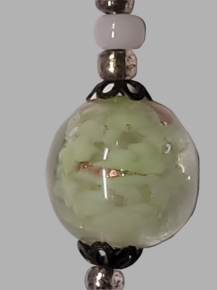 This unique vintage necklace features vibrant red and green glass beads with intricate marbled patterns encased within. The spherical beads are delicately spaced with silver-tone accents, creating a harmonious blend of bold color and subtle shimmer. Designed with a secure twist clasp, this necklace is both stylish and secure, perfect for adding a touch of retro charm to any outfit. Ideal for those who appreciate vintage-inspired jewelry with a pop of color.