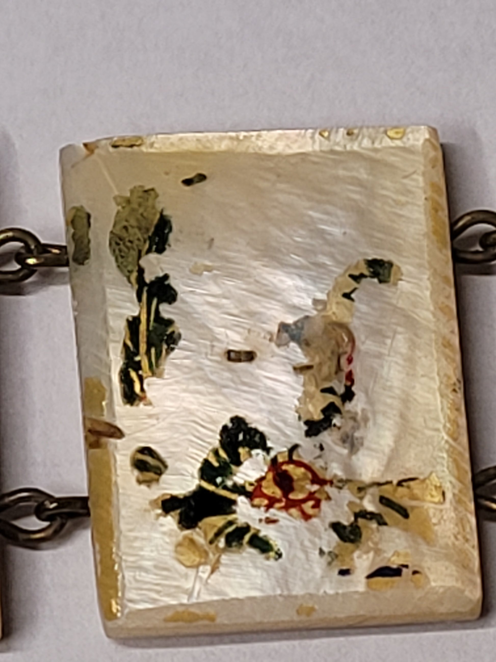 Experience the charm and elegance of a bygone era with this exquisite vintage hand-painted bracelet. Each rectangular plaque is meticulously crafted from mother-of-pearl, adorned with intricate designs that reflect skilled craftsmanship and rich cultural heritage.